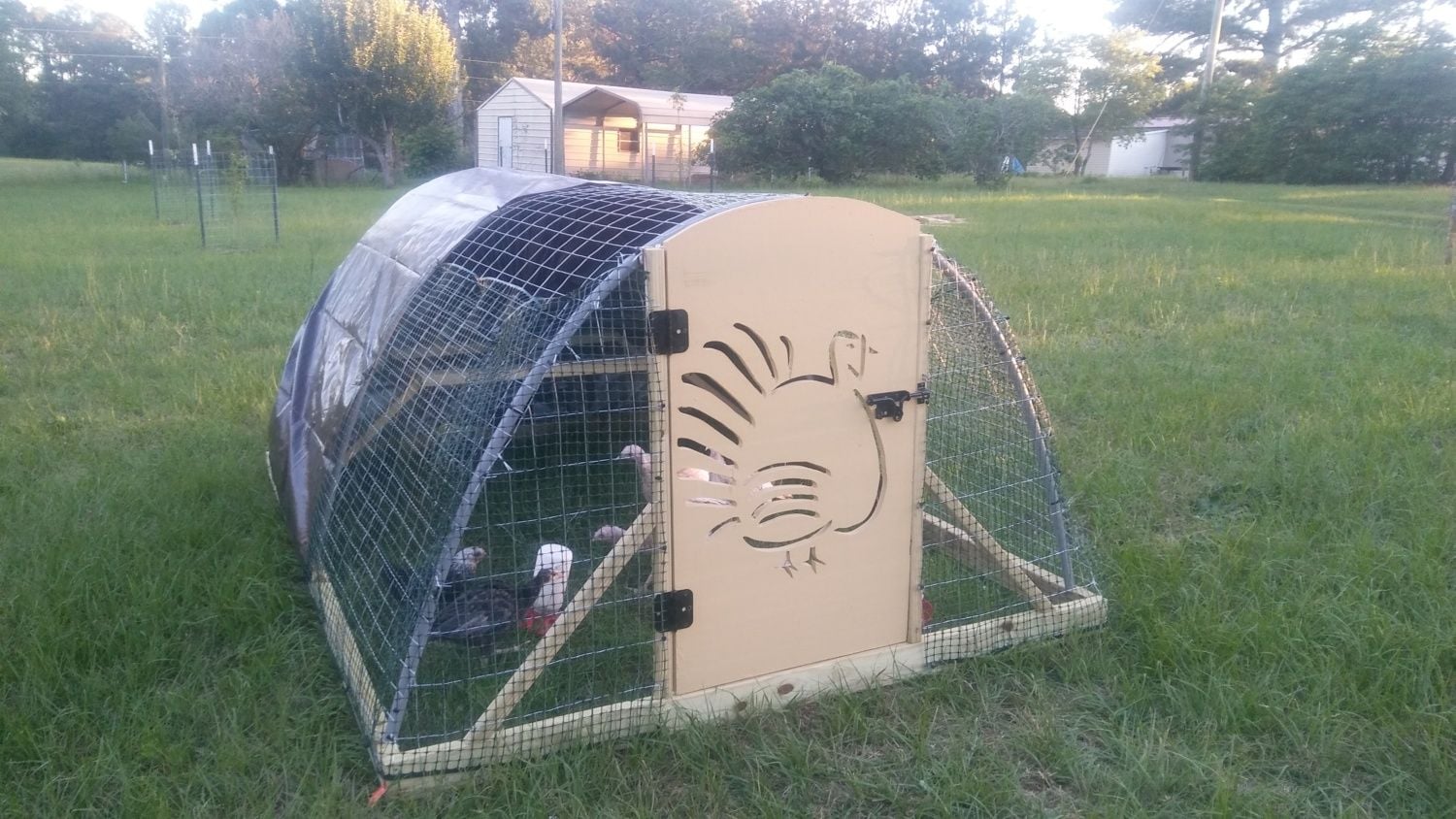 My husband built me a cute turkey tractor. I contributed by making and painting the door. So we put all 4 of our turkeys together and the two chickens that were keeping one of the turkey's company. I don't think they knew what to do with all the space and grass.