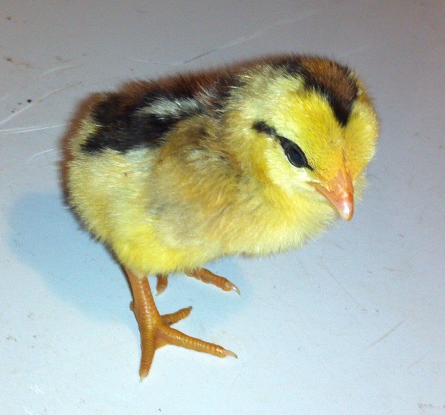 Another mystery hatch SOLVED. Except this one wasn't supposed to be a mystery... I had a bantam laying eggs in the big pen with the rest. She had been "friends" with the porcelain d'uccle that I sold off on Christmas Eve. So when I brought her eggs inside, I figured it would be from him. Yesterday morning, he hatched soon after I woke up. But I never looked at him. I went grocery shopping, and opened the incubator to take him out after I got back. To my surprise, he didn't have the yellow/black blended color like a porcelain d'uccle should have, nor the semi-splotched dark coloring that the hen throws sometimes. Instead, he had very distinct stripes on his back, and through his eyes, with a distinct V-shape pattern on his head. But what threw me off, is that he has bright yellow legs and beak! I only have one breed with yellow legs and beak, and that's leghorn. But my leghorns are both HENS - I don't own any rooster with yellow legs and beak! And especially not any bantams, which is what the egg definitely was (I even know exactly which hen it came from). I was stumped! That was, until this morning, when I remembered that one of my chicks came to me last year from McMurray Hatchery with very distinct markings like that. No blending, no shading, and very defined lines where each color stopped and started. And most importantly, he had the stripe going through his eye. So I looked it up on the website, and sure enough these chicks will HATCH with yellow beaks and legs, but they turn darker as they grow up. So somehow, my little bantam hen was pinned down at some point by... My large fowl PHOENIX! Look at that cute wittle face!