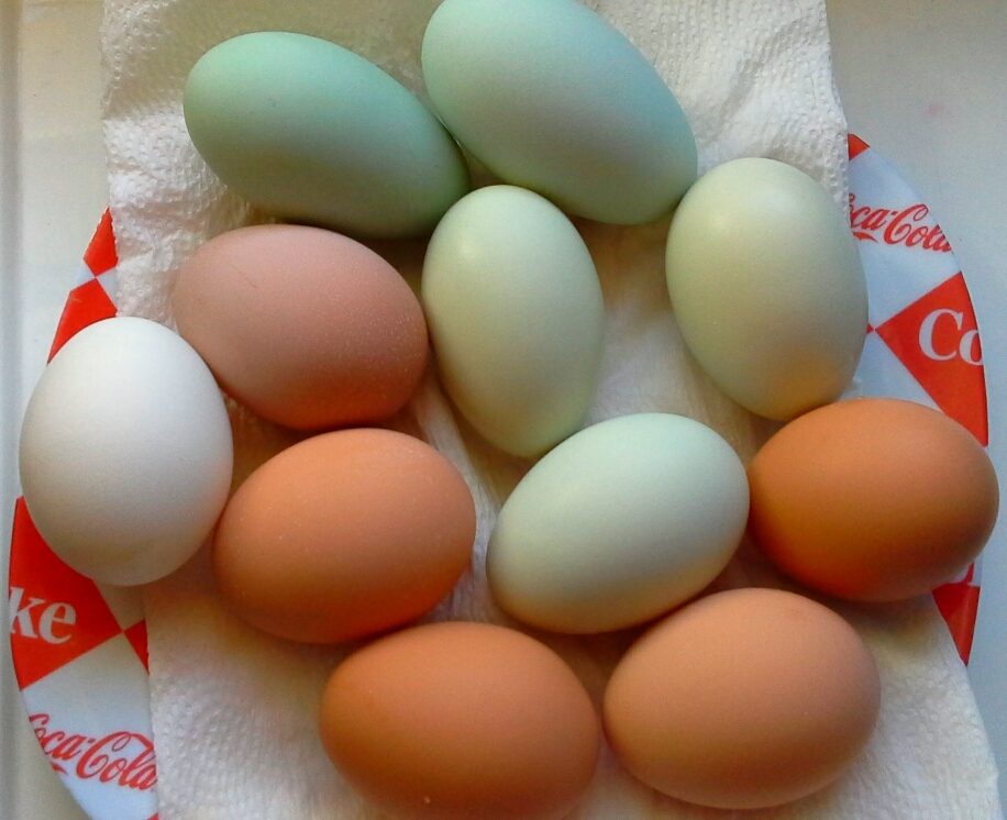 See the sea blue- green at the top? Then there's 2 light olive eggs under that. A very light blue under those. The far left is a white egg.