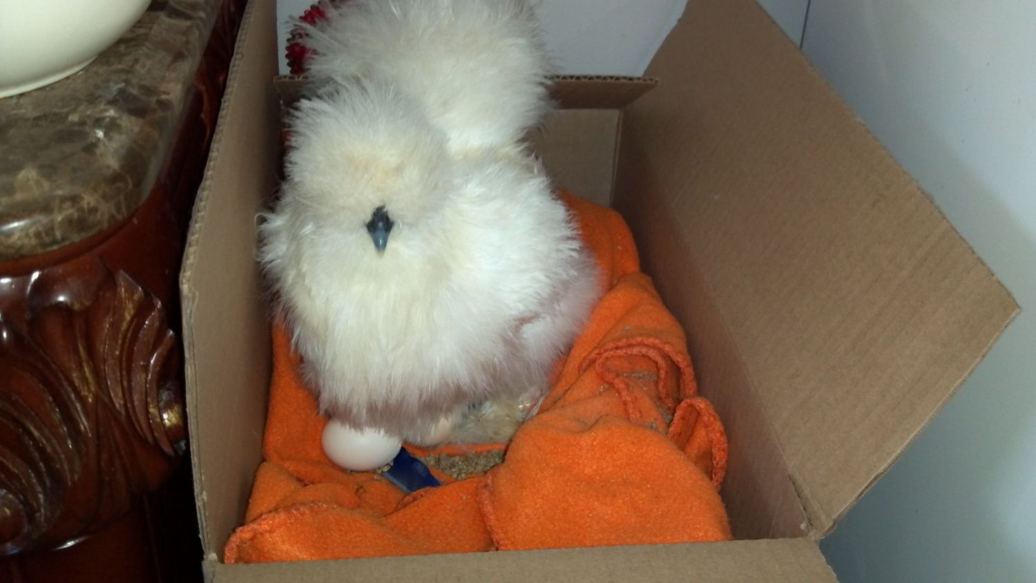 The hen laying an egg after bath time, while warming back up in my bedroom.