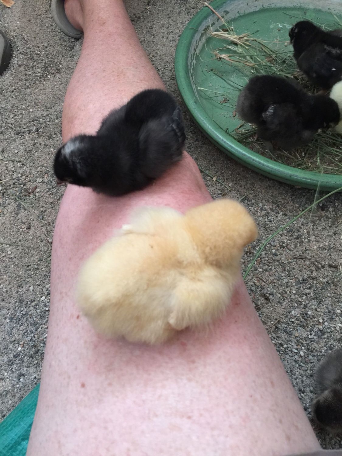 Those are the best moments! Especially when they climb on you on their own. Love the little black one with the white spot. Black Australorp? I have Biel Silver Wyandottes that look like that.